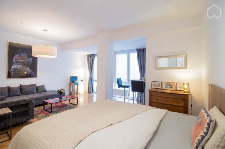Wellness oasis in the middle of St. Georg,with fitness room, pool and private parking, near Hbf Brand new furnished apartment in a modern house. Perfect location, 5 minutes on foot from the main station. Connection to U1, U2, U3, U4 and S1, S2, S11, S31, S3, HVV Buses and ZOB, 2’ minute walk to HAW, University of Applied Science Hamburg The trendy Sankt Georg district with bars, cafes and restaurants. Outer Alster can be reached on foot. Museums, galleries, cinemas, musicals and Hamburg city centre. Luxurious room with box spring bed, sofa corner and dining area. Fully equipped kitchen, bathroom and guest toilet....