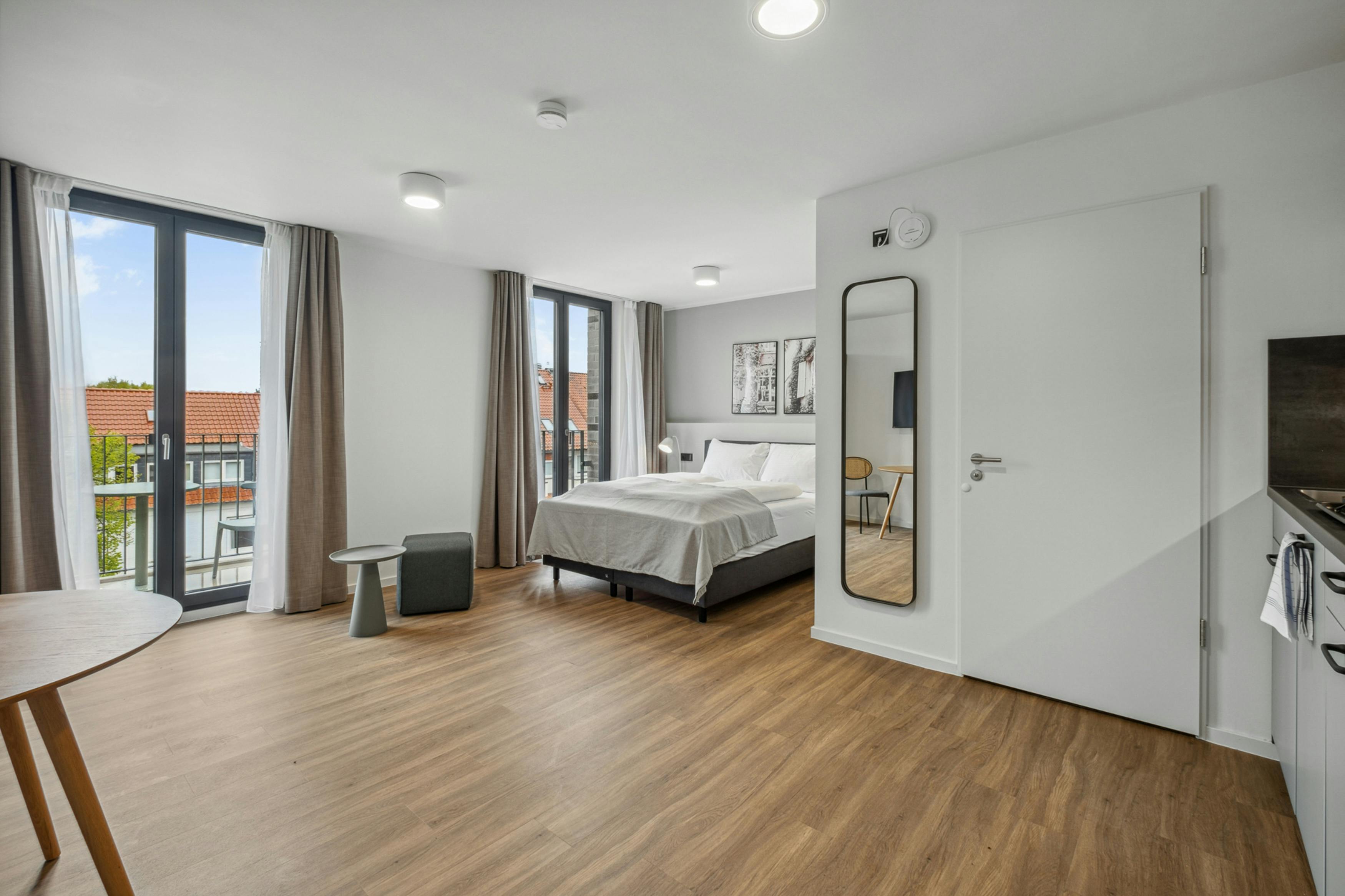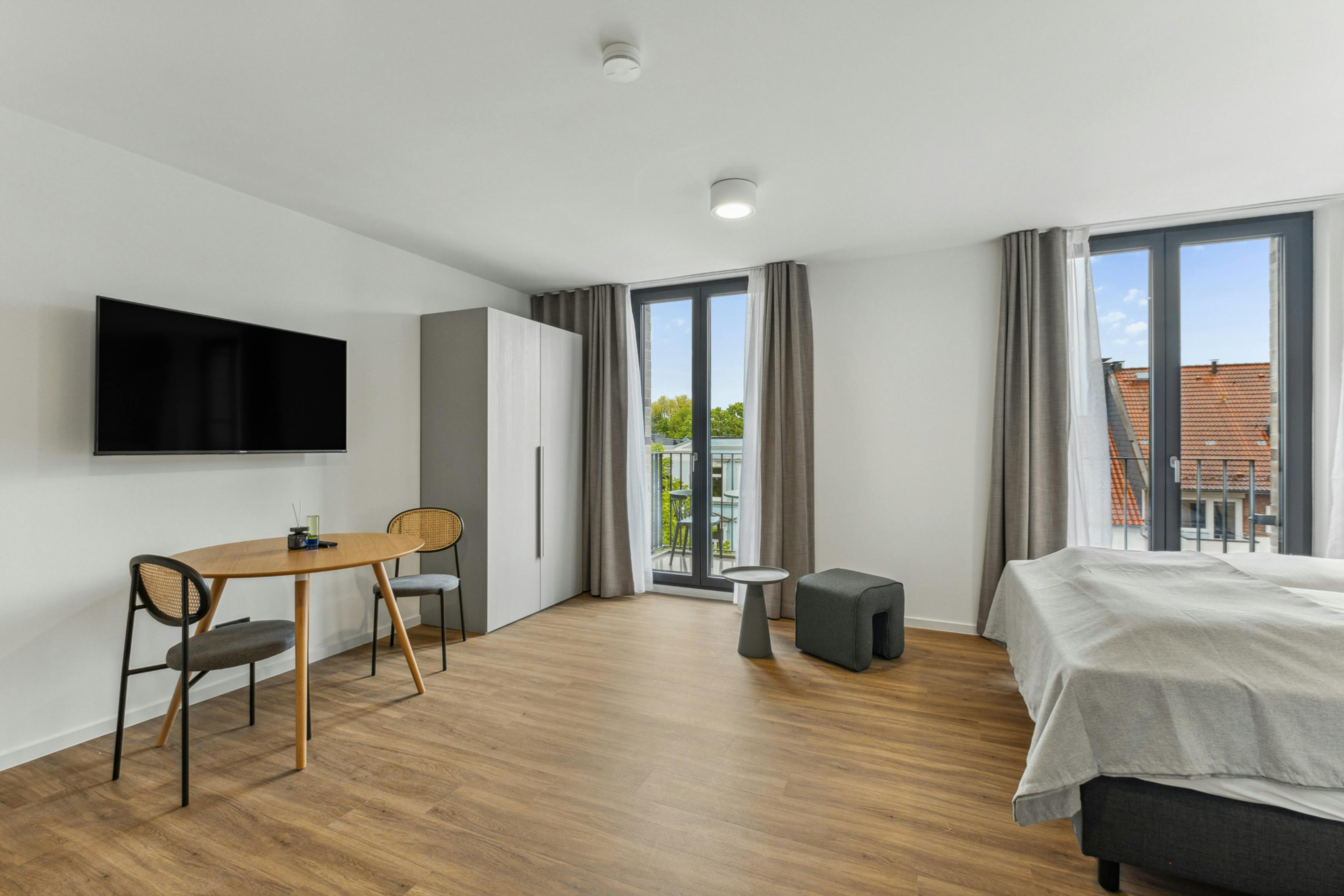 Our 28-32 m2 Suites with balcony for stays over 28 nights have been furnished to our highest modern standards. The Suites feature a fully equipped kitchen with a small dining area, a comfortable box-spring bed (1.60 m) including a modern smart TV and a private bathroom with shower to make you feel at home. The room layout is rounded off by your private balcony, where you can enjoy some sunshine. In case of dirty laundry, you have the option of washing your clothes in the communal laundry room. Therefore your apartment offers everything you need for a longer stay with...